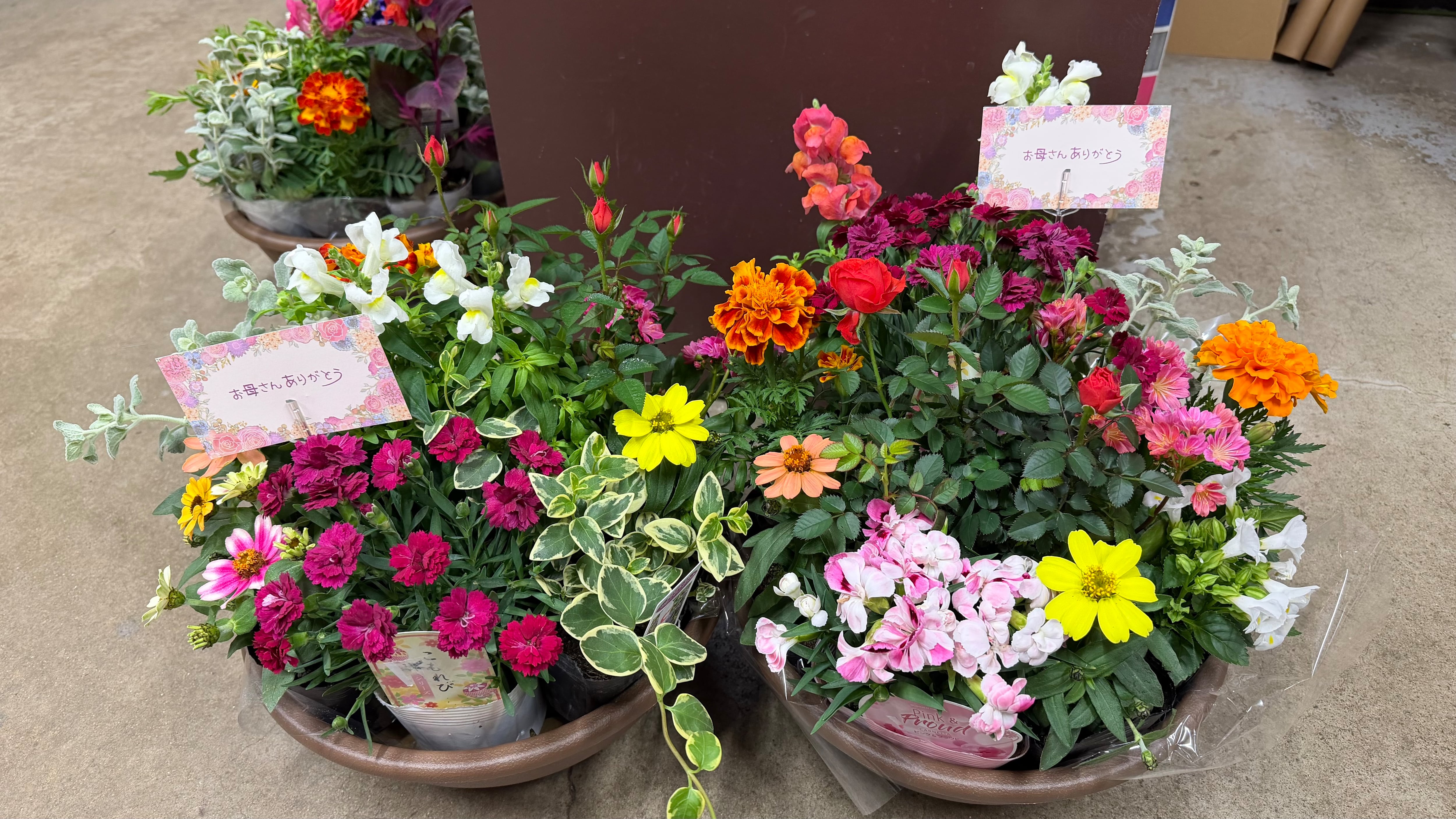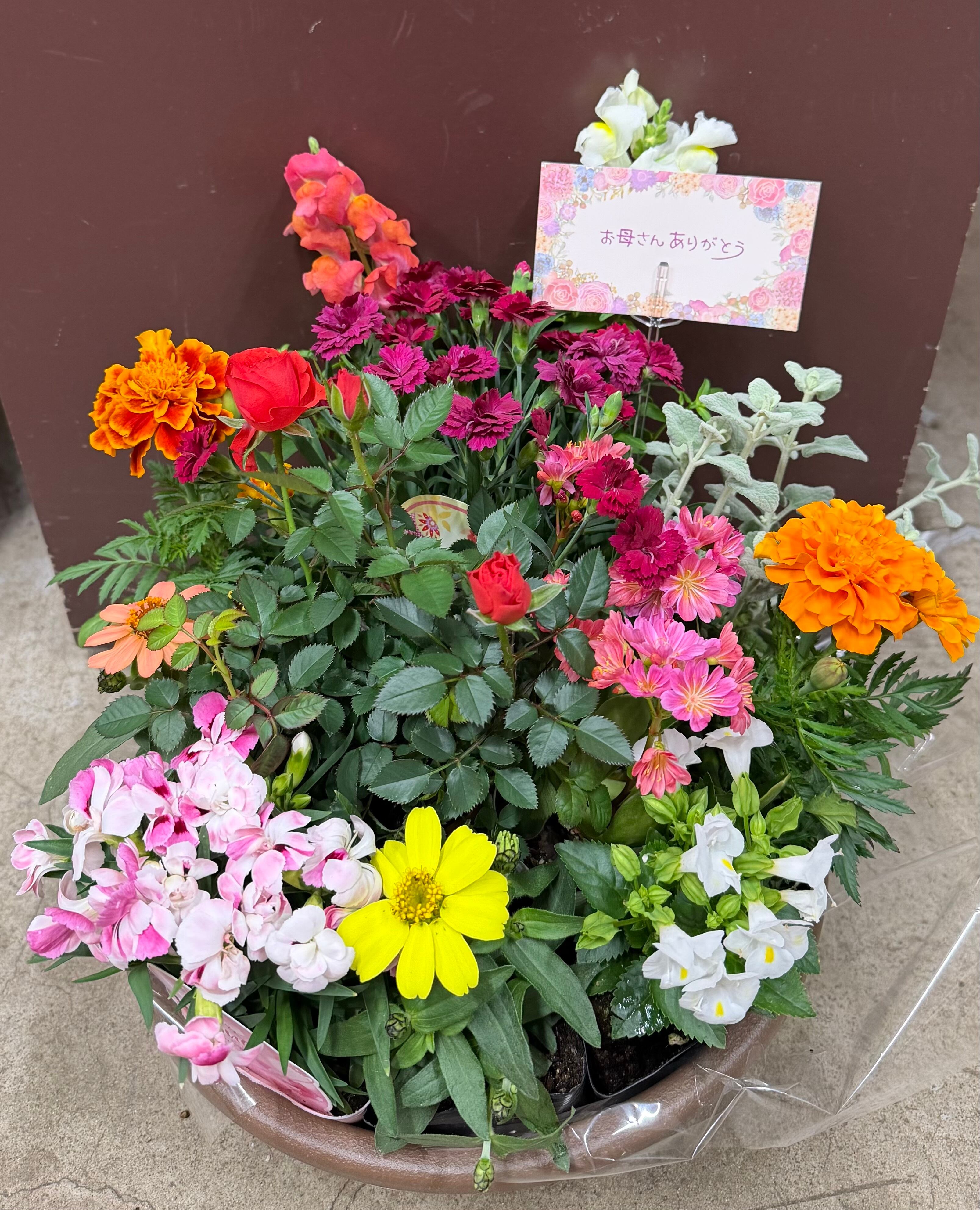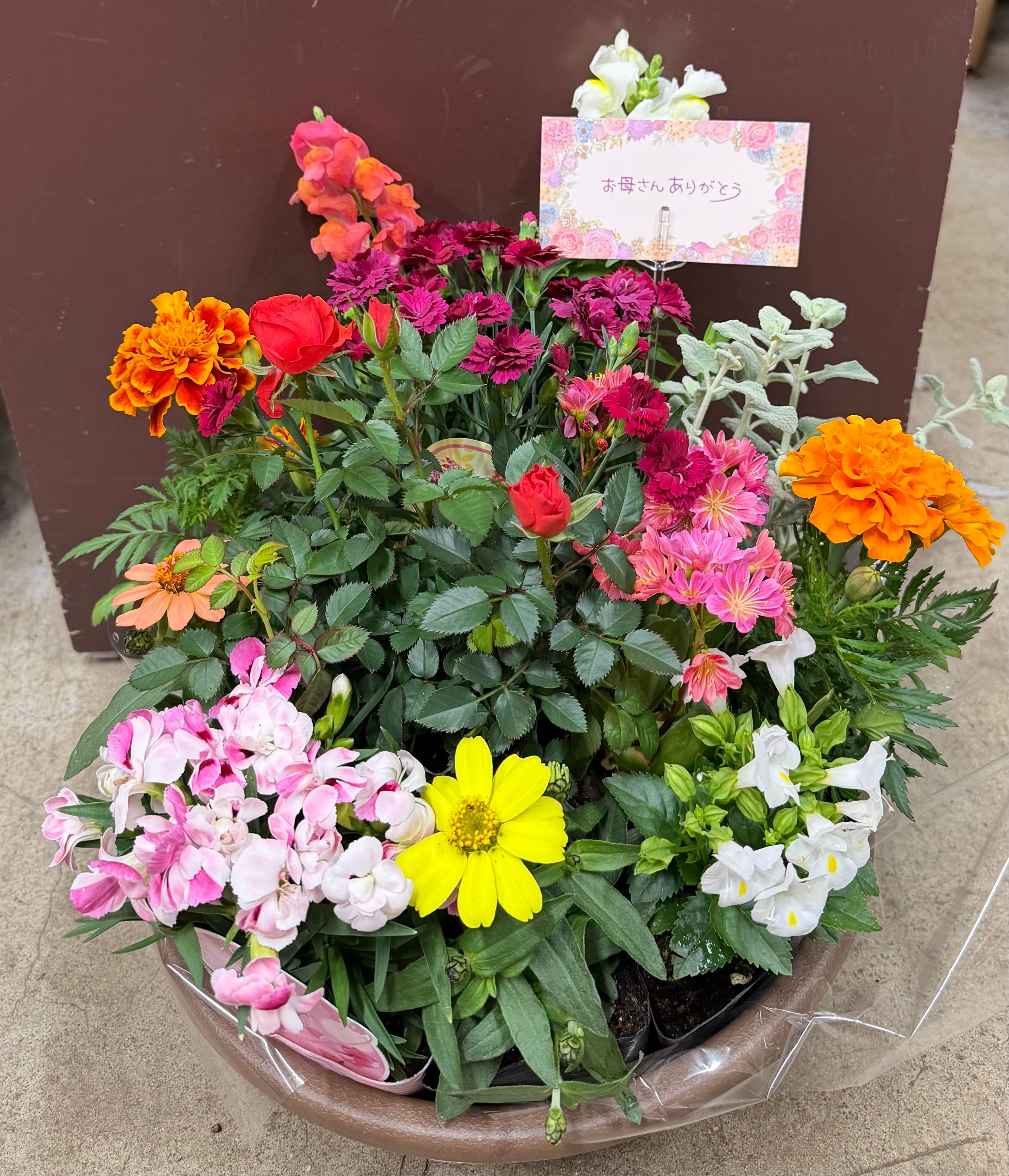 カーネーションなど母の日の特別な季節のお花の寄せ植えです。